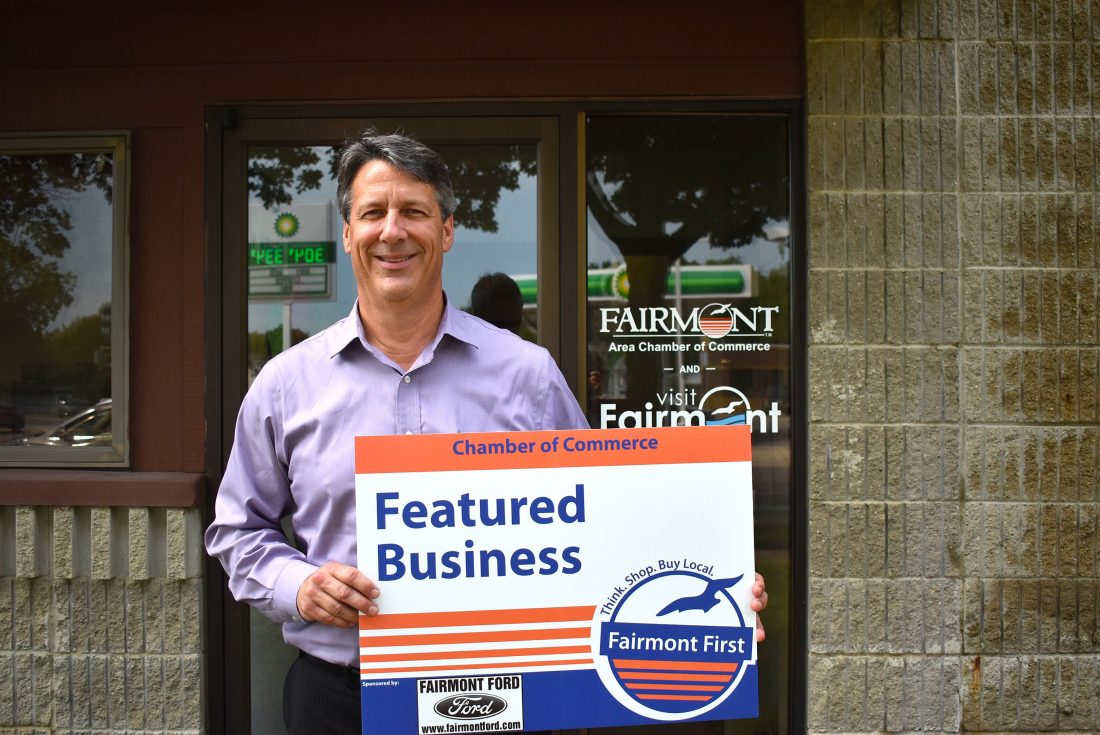 Ned Koppen, President of the Fairmont Area Chamber of Commerce, displays a new featured business sign that will be at various featured businesses each month.