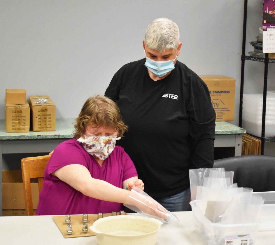 Dawn Dolittle, left, works to package Fastenal parts at the STEP facility in Fairmont. Direct Support Professional, Marilyn VanDenHemel, is available for assistance.