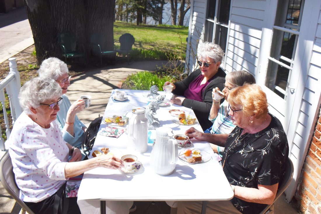 ABOVE: From left Kathy Mathiason, Pam Hill, Carol Hazard, Harriet Danielson and Carolyn Thompson engage in conversation while enjoying tasty treats and fresh brewed tea and coffee late Saturday morning on the outside patio of the historic Chubb House in Fairmont.