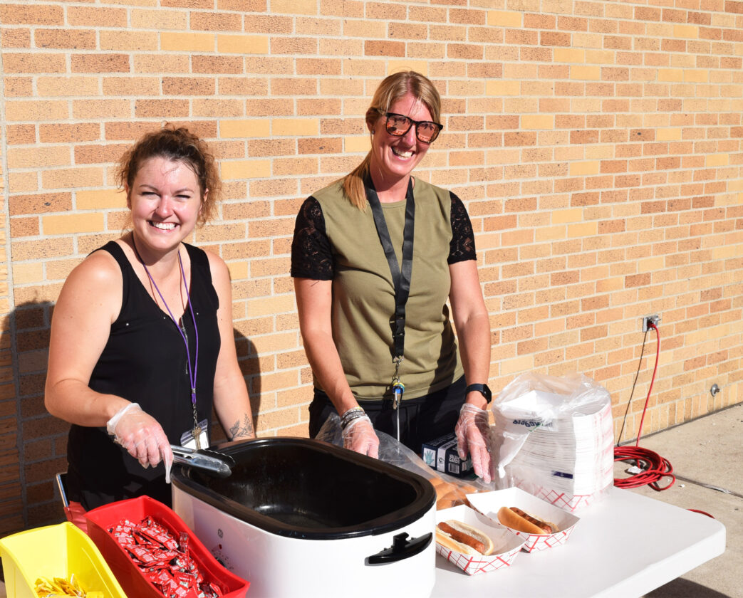 ABOVE: Kayla Ekstrom and Keri Murphy hand out food at Granada Elementary School for the district's first family fun night on Monday.