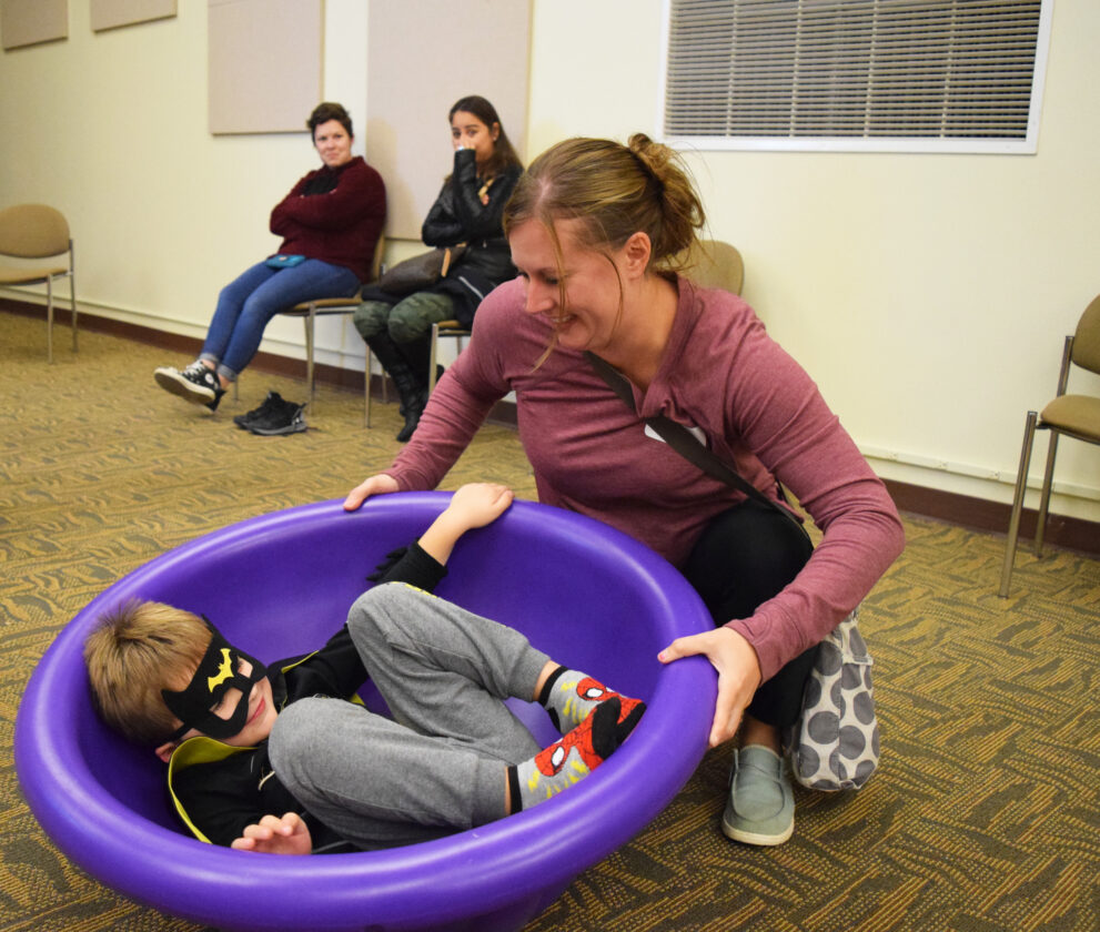 ABOVE: Jess Urban and her son Grayson, 4, play during the Kids Just Want to Have Fun committee's mother-son superhero event on Saturday in the Southern Minnesota Education Campus Building in Fairmont.