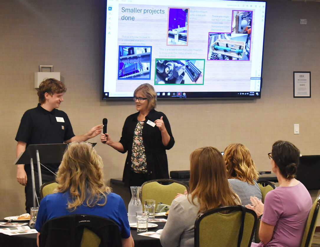 ABOVE: Noah Vetter completes his presentation on his summer internship at Avery Weigh-Tronix before handing the mic off to Tammie Hested with Minnesota Valley Action Council (MVAC) Thursday morning during the Martin County/MVAC summer internship recognition program.