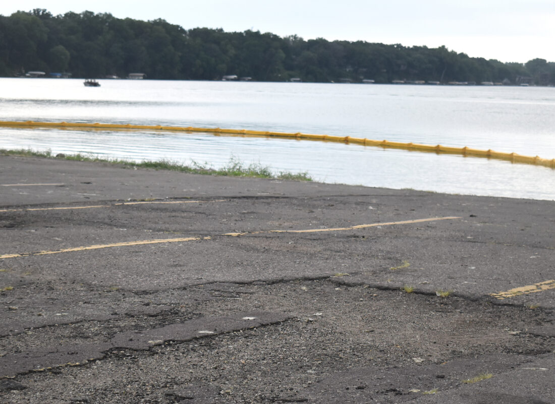 ABOVE: Work on the Gomsrud Park north parking lot and two boat ramps will begin next week. This week, a yellow floating silt fence to stop silt and debris from going farther in the lake was put in on Budd Lake in anticipation of the start of the project.
