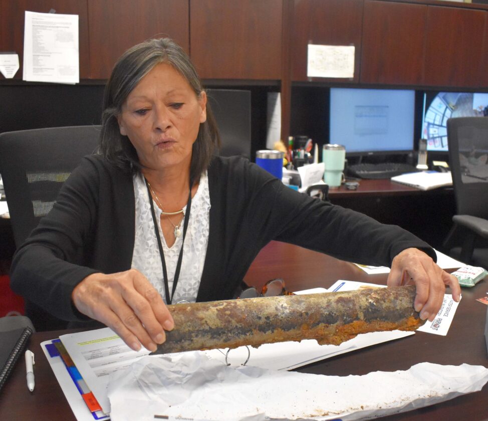 ABOVE: Fairmont HRA Director Gail Diede holds a piece of heavily corroded pipe removed from the Friendship Village plumbing system. Issues like this were submitted in their application for funding that netted them $1.9 million for this and other issues.