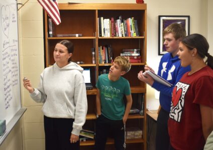 ABOVE: From left: senior Belinda Lutterman, seventh grader William Hamlet, freshman Thor Olson and freshman Georgia Werre look at and discuss both sides of a potential topic for the second half of their debate season.