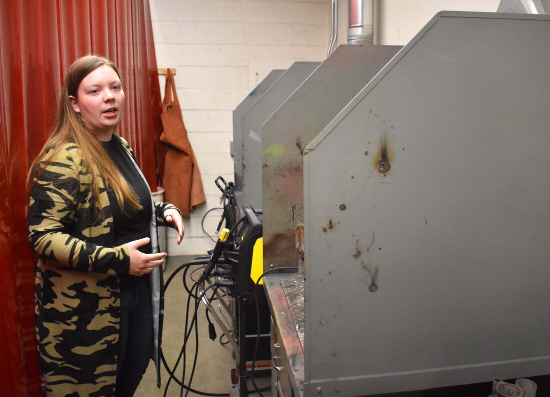 ABOVE: GHEC Shop teacher Gina Huhnerkoch shows the limited amount of welding booths the school has now. The referendum, if passed, will allow for additional booths to be added for student use.