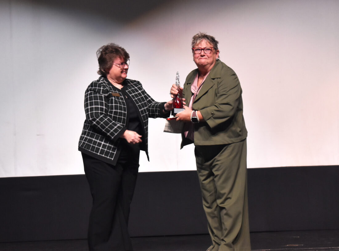 ABOVE: Roxy Janke, right, is overcome with emotion as she is presented with her award for being inducted into the inaugural Fairmont High School Fine Arts Hall of Fame by presenter Louise Hendricks.