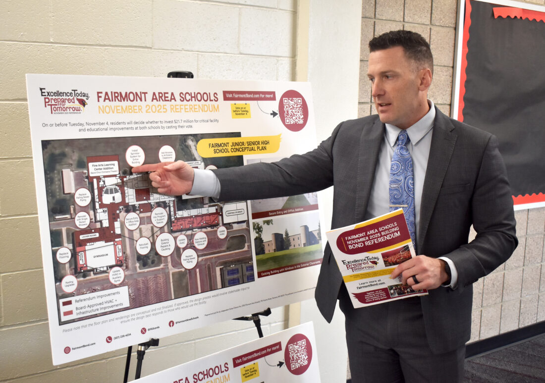 ABOVE: Fairmont Area Schools Superintendent Andy Traetow goes over the referendum projects shown on poster boards at Fairmont High School. Part of the referendum is covered by the state via the Ag2School incentive.