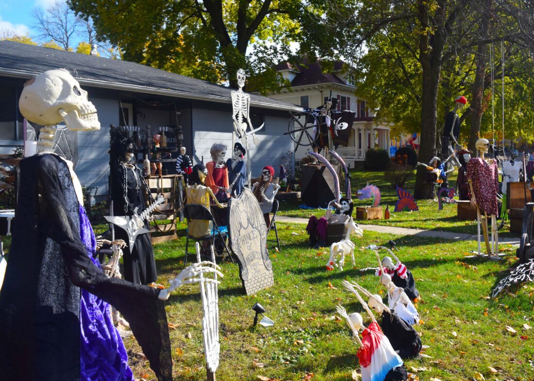 ABOVE: Many skeletons, with different costumes and props, stand in a yard on Albion Avenue in Fairmont, ready to contribute to Halloween fun.