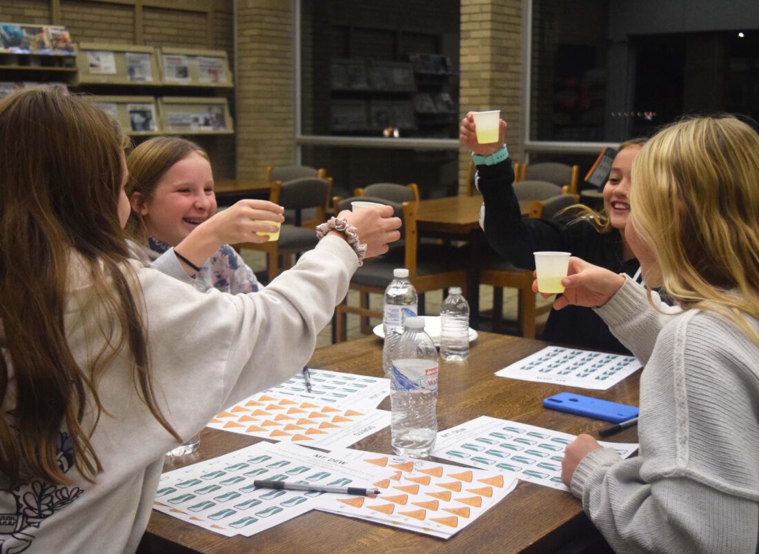 ABOVE: With laughter, Violet Olson, Ivory Haugen, Neela Nigon and Claire Olsen clink plastic cups with Mountain Dew soda during the Taste Testing activity at the Teen/Tween After Hours event on Tuesday evening in the lounge area at the Martin County Library in Fairmont. Nine children were present to celebrate the final Teen/Tween After Hours event of 2025. The program is expected to return in January 2026. Photo by Vanessa Schultze.