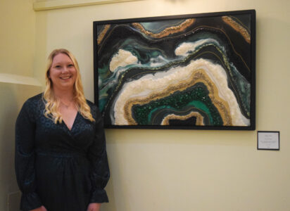 ABOVE: Artist Sydney Wren stands beside one of her displayed works, “Emerald Dream,” during the Artist Reception event on a snowy Sunday afternoon at the Red Rock Center for the Arts in Fairmont.