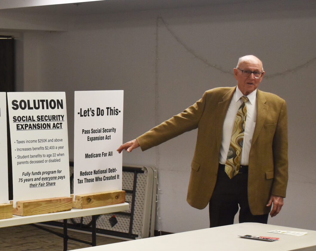 ABOVE: Touring Social Security speaker, Vote 2 Protect founder, and Minnesota Farmers Union member Brian Rohrenbach lays out his information and views during a presentation on Social Security and the Social Security Expansion Act Saturday at the Martin County Library in Fairmont.