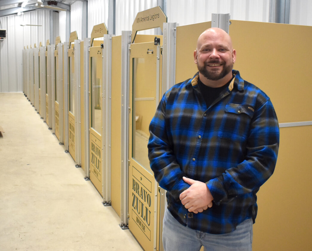 ABOVE: Ben Dziobek, who is currently in the Bravo Zulu House program, stands with the dog kennels which will soon hold dogs for the house’s animal therapy program.