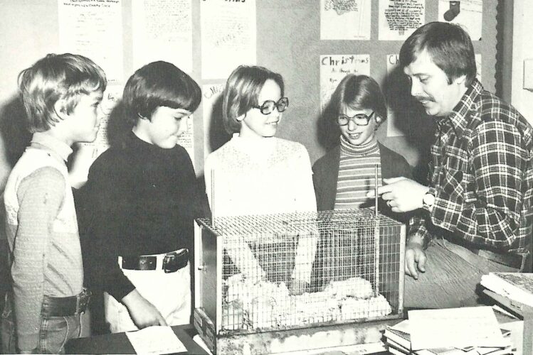 ABOVE: Lenny Tvedten stands with some of his students while teaching a 5th grade class at Lincoln School in Fairmont in 1978. Tvedten spent 30 years as a teacher before he became director of the museum. Submitted photo.