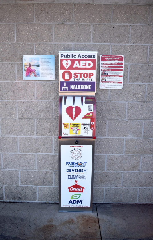 ABOVE: This box at the Jeffrey Kot Soccer Fields in Fairmont contains an AED and Naloxone, better known as Narcan, as well as instructions on how to use them. The box, from Advocates for Health, was donated by the Larsen family after Terry and Roxanne Larsen’s daughter Faith Larsen went into cardiac arrest during a pick-up basketball game at the age of 19 and an AED was not available to save her.