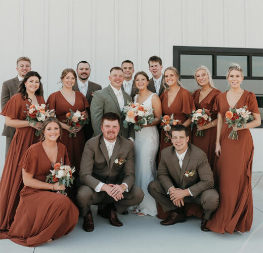 ABOVE: Carson and Andrea Toomer and their wedding party, dressed in a fall color palette of burnt orange, brown and olive green. Photo courtesy of Morgan Maxine Photography