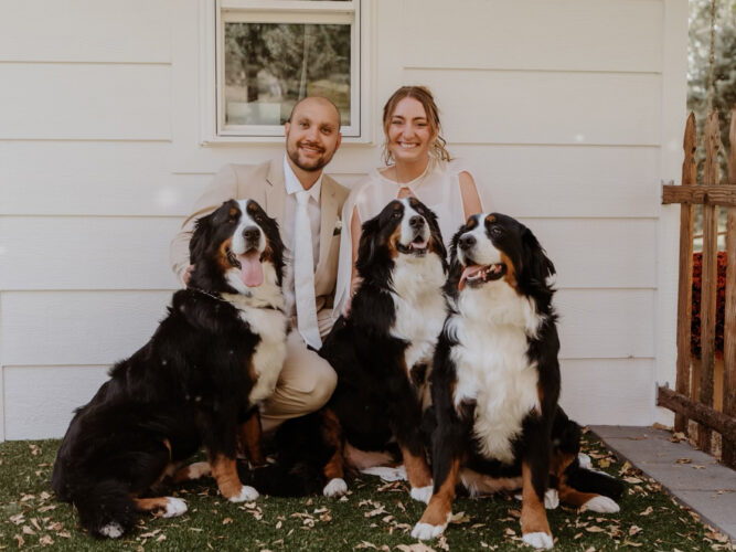 ABOVE: Steven and Mallory Krumholz and their three Bernese Mountain Dogs, Mabel, Georgia and Frankie, who got to take part in their big day. Photo courtesy of Hinton Studios