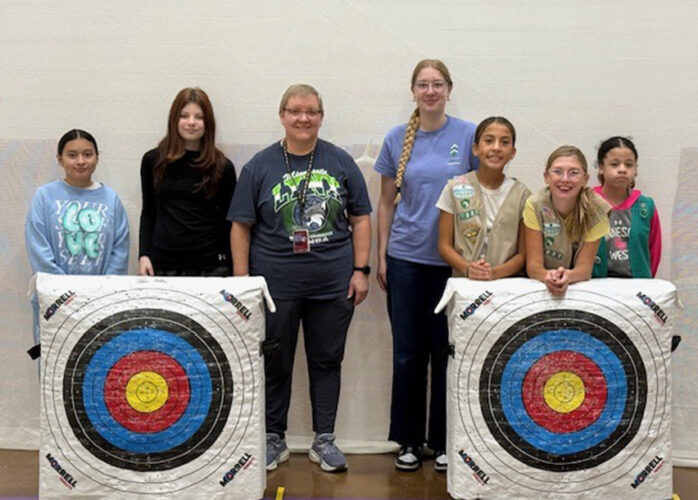 ABOVE: Members of the Martin County Girl Scouts learn archery skills, with the help of Fairmont Phy Ed Teacher Chris Engleby. From left: Melenie Gonzalez, Ashlynn Willner, Instructor Chris Engleby, Student Assistant Leader Madison Sokoloski, Emma Byers, Nevaeh Curry and Amelia Spicer. Submitted photo.