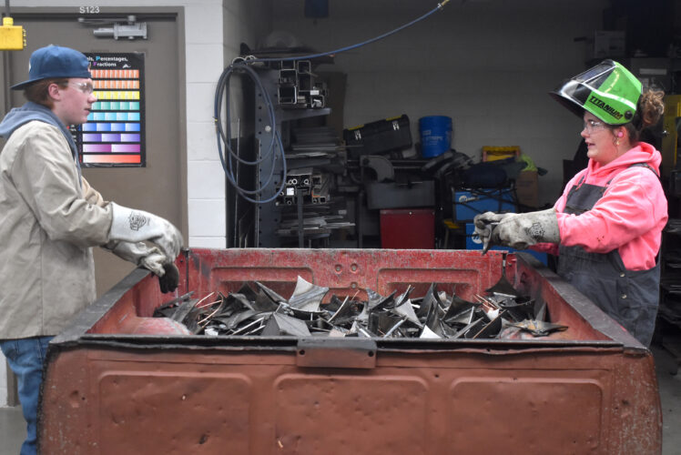 ABOVE: Seniors George Walters and Gretchen Jorgensen talk about a weld in Jorgensen’s hands during their welding class on Tuesday.