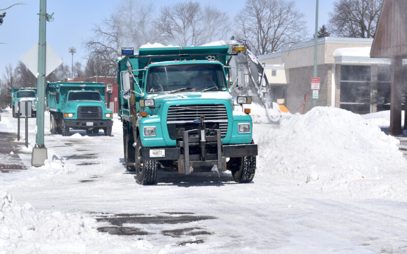 ABOVE: After having cleared off the roads, a much larger snow blower drives through the medians of snow on North Park Street in between the U.S. Bank Branch and St. Martin’s Episcopal Church, depositing them into a City of Fairmont dump truck, with more trucks waiting behind it.