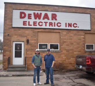 ABOVE: DeWar Electric Co-Owner Tyler Klingson and Division Manager Josh Nickel stand in front of DeWar Electric in Fairmont, which has been at the same location for 46 years. Klingson said they plan to re-purpose the sign pictured in the new location at 805 East 10th Street.