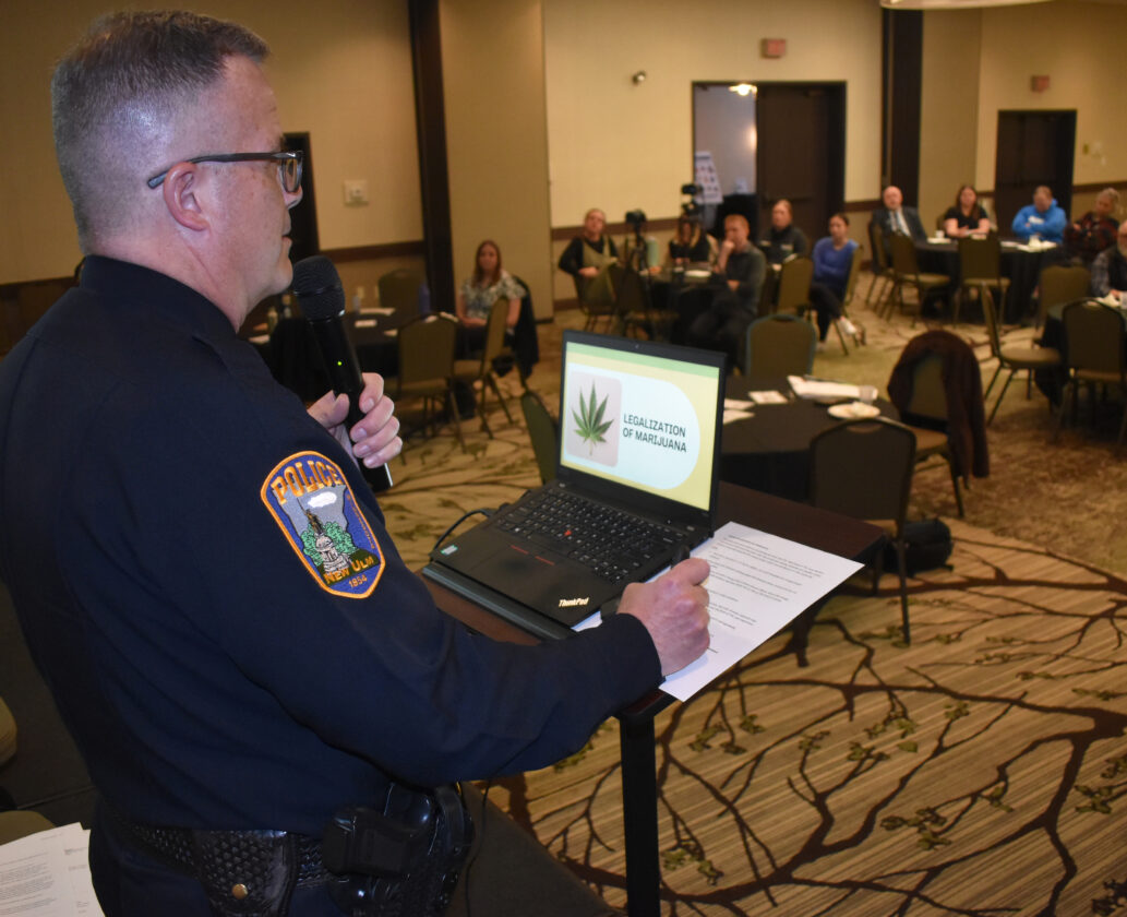ABOVE: New Ulm Police Chief Dave Borchert talks about how law enforcement deals with cannabis and related topics at a seminar with law enforcement and public health leaders at the New Ulm Conference Center.