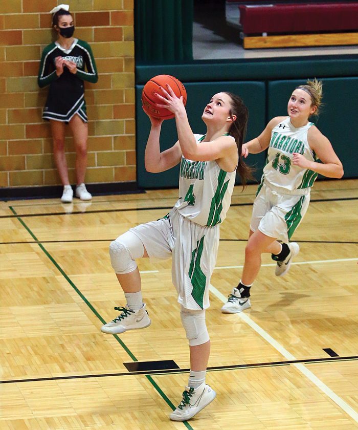 LAYUP TIME — North Union guard Lily Henderson (4) connects for a layup as Warrior teammate Vanessa Von Bank watches the basket during Top of Iowa Conference action Thursday night in Armstrong. Von Bank went on to score 20 points to pace the Warriors’ win over North Iowa. (Photo by Greg Abel)