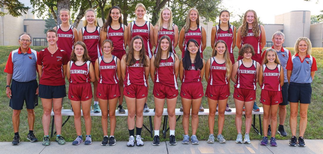 AT THE STARTING LINE — Members of the Class AA No. 6-ranked Fairmont Cardinals girls cross country team opening the season by playing host to the Early Bird Invitational on Friday, Aug. 27, on the Fairmont High School campus include, front row (l-r): Head coach Bob Bonk, assistant coach Jen Kahler, Ainsley Malo, Rylee Maday, MaKayla Lowry, MaKenzie Lowry, Lily Higgins, Carys Gudahl, Samantha Domeier, Kendra Blomster and assistant coach Holly Neusch. Back row: Audrina Suckow, Ella Krahmer, Eleanor Hamlet, Paige DeBoer, Macy Hanson, Emma Gudahl, Laura Thompson, Norah Traetow and assistant coach Stew Murfield. (Photo by Greg Abel)