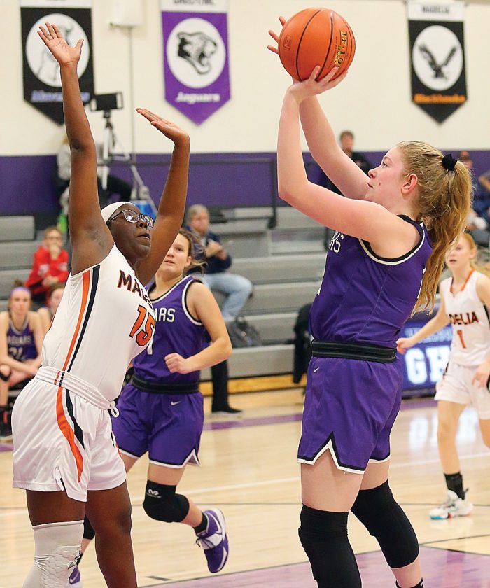 Mattson and Bethany Petrowiak spearheaded the Jaguar reserves’ quick six-point blast with Mattson driving the lane for a 10-footer. Bethany Petrowiak then swiped the inbound pass and hit a layup for two of her eight points before spotting Mattson for a bank shot from the lane for a 19-1 lead.