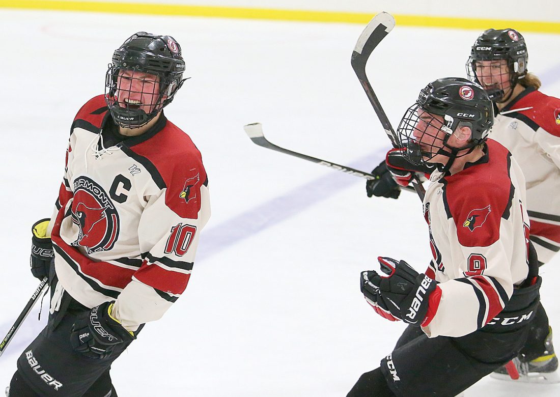 KEY ASSIST — Fairmont Area’s Eli Anderson (9) celebrates with teammate Hudson Artz (10) after Anderson assisted Artz’s game-tying goal with only six seconds remaining in regulation during Thursday night’s hockey game against Waseca at Martin County Arena in Fairmont. Anderson became the first Cardinal boys hockey player to eclipse the 100-point career scoring mark earlier this season. (Photo by Greg Abel)