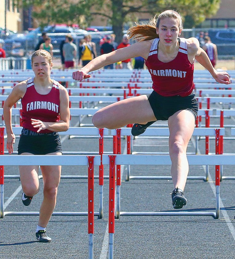 MULTI-TASKING — Fairmont’s Ellie Hernes (right) maintains her lead over Cardinal teammate Hadley Artz during the high hurdles on Bob Bonk Track during Saturday’s track & field triangular in Fairmont. Hernes went on to win the event, with Artz taking second. (Photo by Greg Abel)