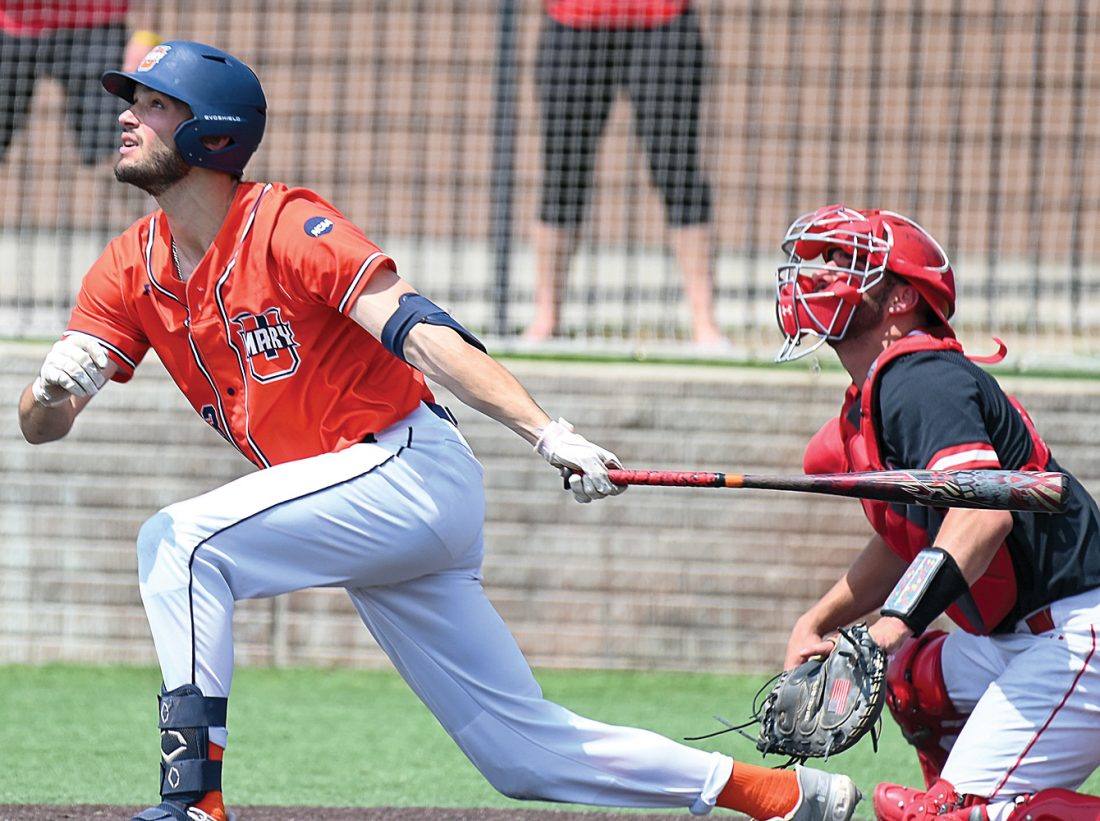 IT’S GONE — University of Mary first baseman Derek Shoen (left) watches the flight of one of his record-setting 14 home runs during collegiate baseball action earlier this season. Shoen, a Truman native, recently earned all-Northern Sun Intercollegiate Conference first-team honors for a second straight year. (Photo courtesy of Brian Larson, University of Mary Sports Information Director)
