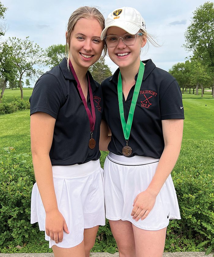 STATE QUALIFIERS — Fairmont golfers Brynn Gustafson (left) and Solveig Senf earned two of five individual state bids from Wednesday’s Section 3AA Meet’s final round at Oakdale Golf Club near Buffalo Lake. (Photo courtesy of Sarah Totzke)
