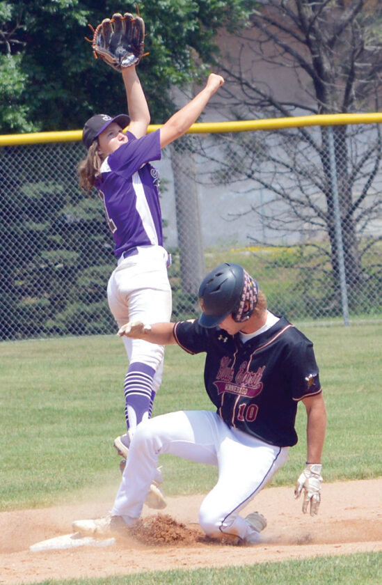 HIGH TOSS — Blue Earth American Legion Post 89/Winnebago Post 82 runner Parker Meyers slides safely into second base with a stolen base as Truman Post 115 infielder McKenna Benck leaps to catch a high toss during a Division 2, Sub-District ‘C’ elimination baseball game Saturday in Blue Earth. (Photo by Charlie Sorrells)