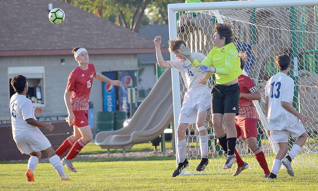 HEADED AWAY — Fairmont Area goalkeeper Jack Kosbab (yellow jersey) outleaps Mankato Loyola’s Parker Jensen (third from left) and heads a Crusader shot out of harm’s way during Big South Conference soccer action Thursday at Jeffery Kot Soccer Complex in Fairmont. The Cardinals’ Isaiah Lockwood (second from left) and the Crusaders’ Ricki Callejas (far left) and teammate Gillum Sivatte (13) watch the action. (Photo by Charlie Sorrells)