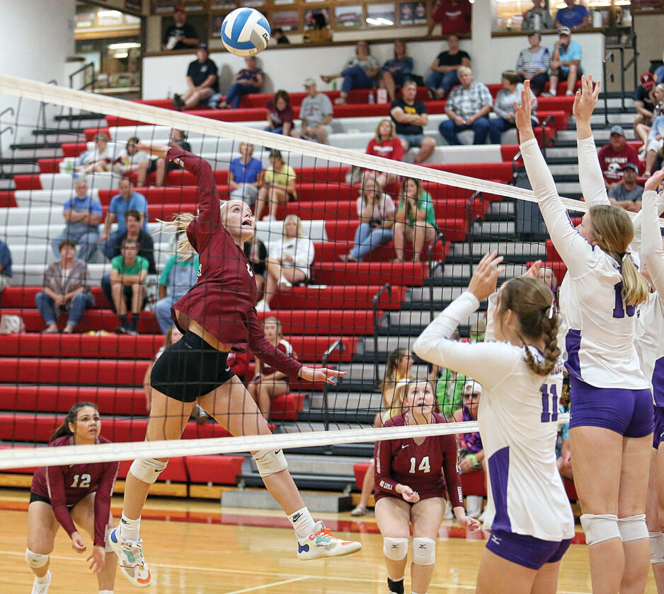 LEAPING STRIKE — Fairmont hitter Jazlyn Geerdes elevates before crushing the volleyball over New Ulm’s Malorie Anderson (11) and Laura Bertrang (far right) during Big South Conference action Thursday night in Fairmont. The Cardinals’ Olivia Ortega (12) and Breanne Steuber (14) look on. (Photo by Greg Abel)