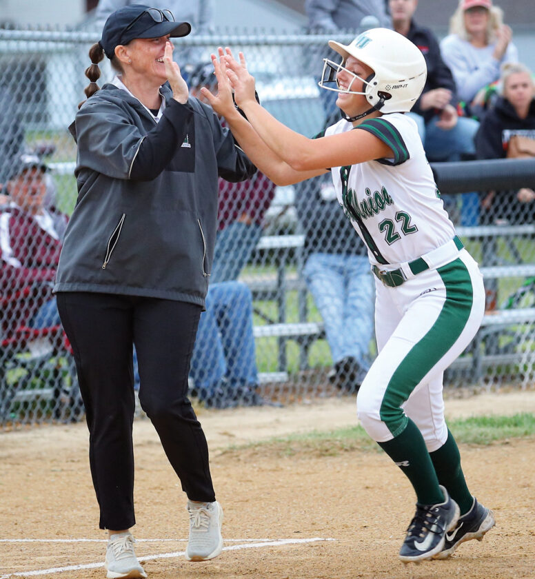 HIGH-TEN — North Union hitter Shallie Walders (right) receives a double high-five from Warriors’ head coach Kim Price after slugging a two-run home run during the bottom of the first inning against Western Christian during the two softball teams’ Iowa Class 2A, Region 1 semifinal game Friday night in Swea City. North Union went on to post an 8-0 triumph. (Photo by Greg Abel)