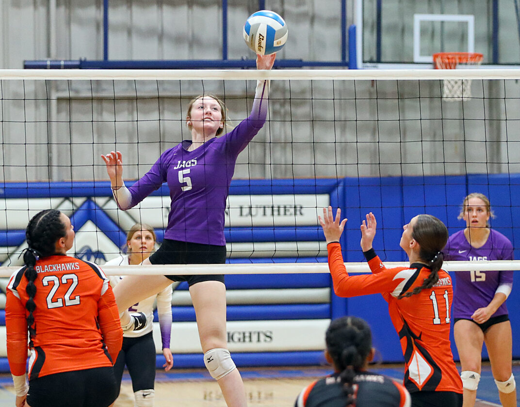 An errant Jaguars’ serve with the home team ahead 8-7 returned serve to Alexis Jacques and the senior defensive specialist reeled off four consecutive points, with Sorenson dropping home a pivotal ace tip for an 11-8 Blackhawks’ lead.
