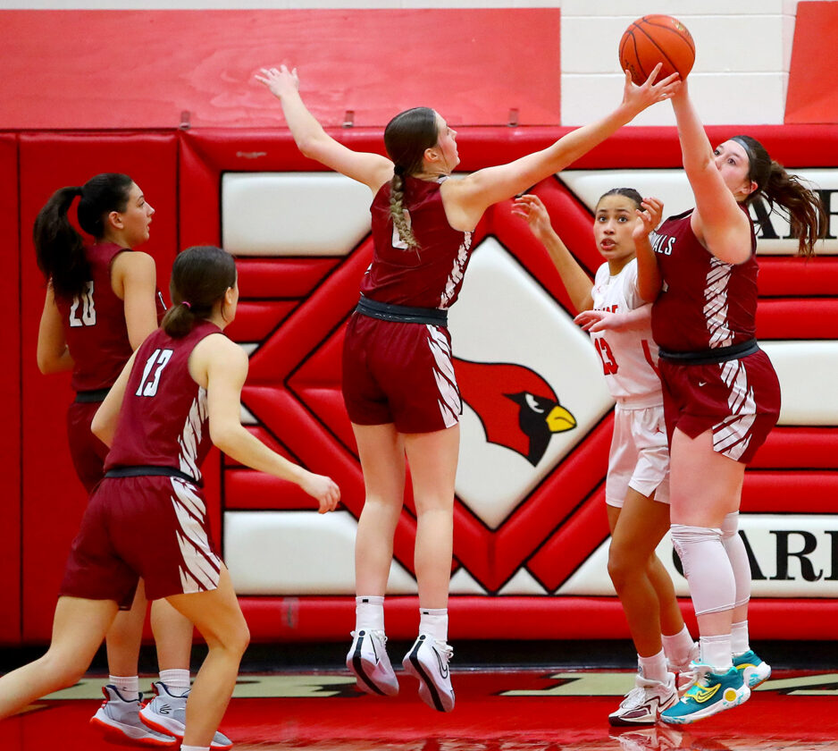 LONG REBOUND — Fairmont’s Brylee Miller (middle) and teammate Nevaeh Rahm (far right) stretch to snare a long rebound during Big South Conference basketball action Thursday night at Cardinal Gym in Fairmont. Fairmont’s Hope Klanderud (13) and Ellie Ortega (20), along with Luverne’s Kira John (second from right), look on. (Photo by Greg Abel)