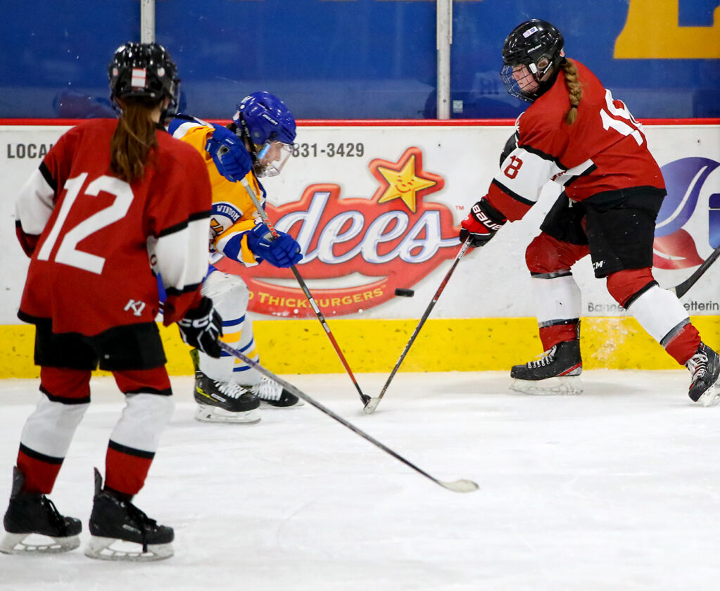 CHIPPED PUCK — Fairmont Area forward Abi Sundeen (18) and Windom Area forward Reagan Haugen click hockey sticks to chip the puck off of the ice during the two teams’ Section 3A quarterfinal game on Thursday night in Windom. Fairmont Area’s Frankie Martin (12) watches the action. (Photo by Greg Abel)