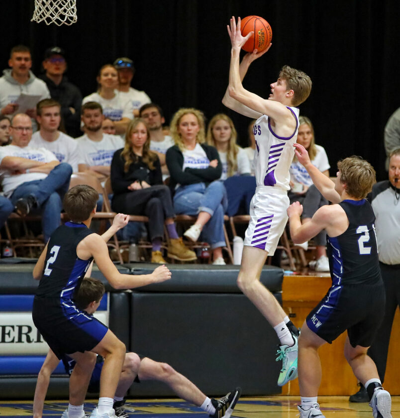AIR FOX — Granada-Huntley-East Chain/Truman/Martin Luther’s Carter Fox shoots around Martin County West’s Jacob Wilmes (far right) during Valley Conference basketball action Saturday night in Trimont. Maverick guard Lucas Larson (2) looks on. (Photo by Greg Abel)