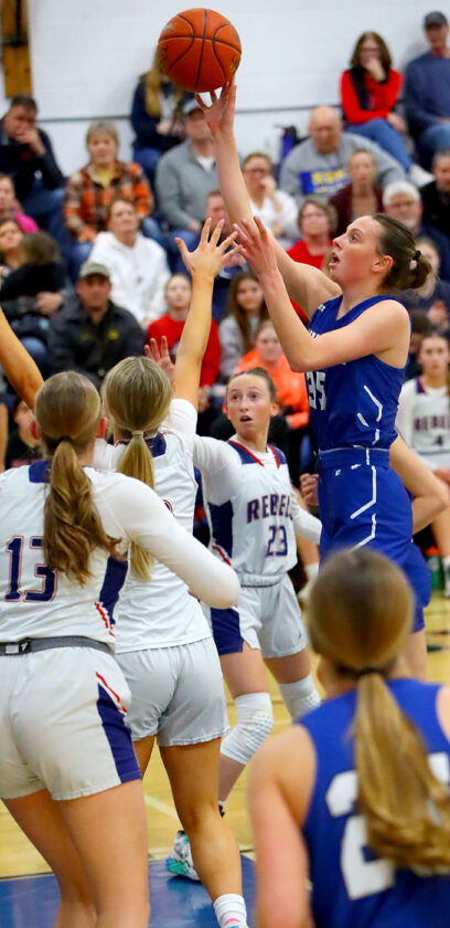 PLAYER OF THE YEAR — Martin County West’s Emily Anderson (35) shoots over three United South Central defenders during the Section 2A basketball playoffs in Sherburn. Anderson has been selected as the Sentinel All-Area co-basketball player of the year. (Photos by Greg Abel)