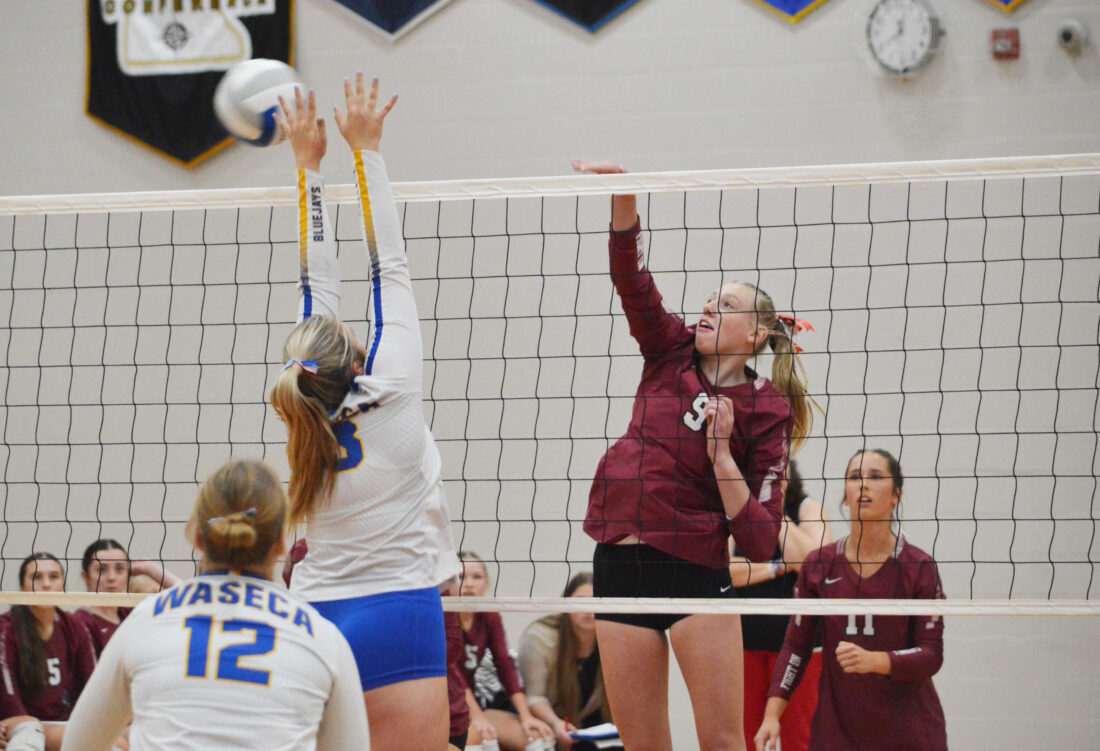 ABOVE: Fairmont’s Jadyn Montgomery directs the ball past a Waseca defender during a Big South Conference volleyball match Monday in Fairmont.