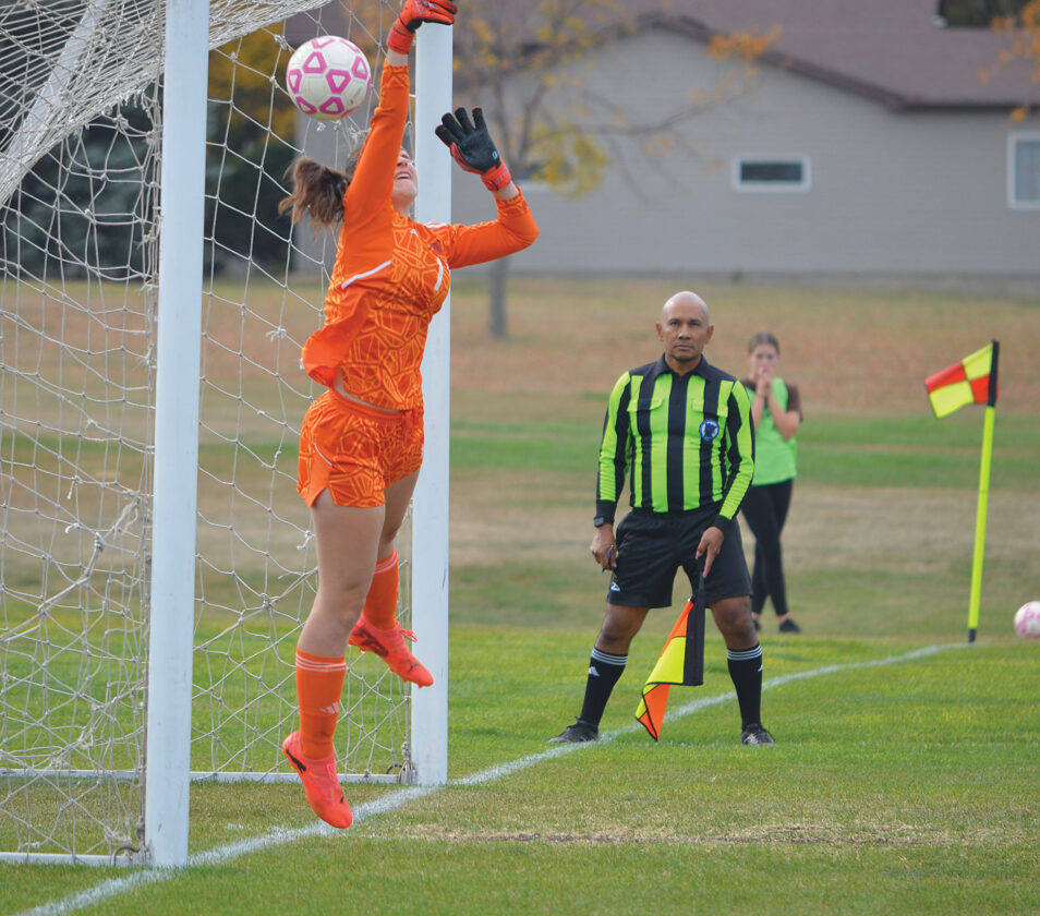 ABOVE: Fairmont goalkeeper Mary Bennett goes for the save in the game-deciding penalty kick round of the Section 2A Girls Soccer Tournament semifinals at Kot Fields on Saturday.