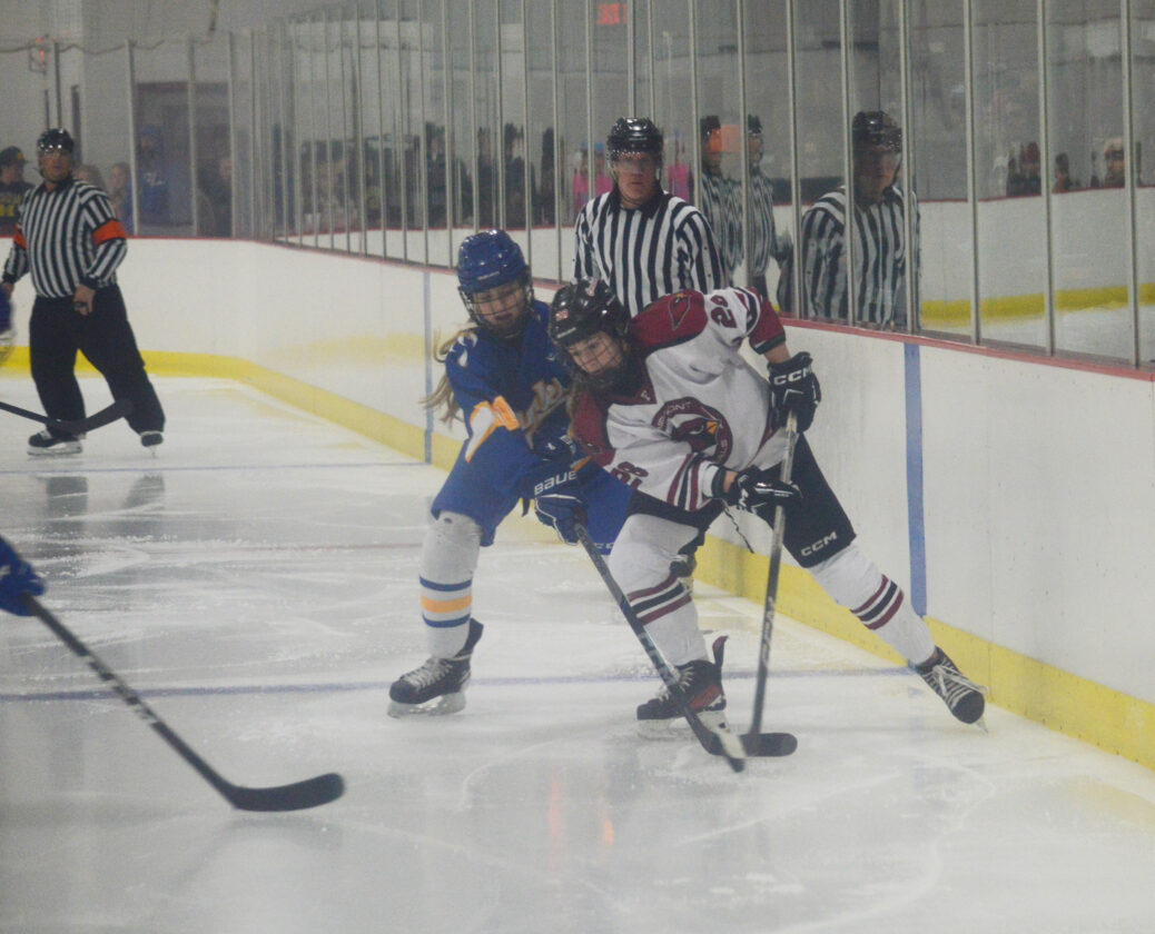Staff photo by Jake Olson: Fairmont sophomore forward Alexis Haycraft is challenged by a Windom defender during the first period of Monday night’s game at the Martin County Arena. Haycraft finished the night with four goals and one assist.