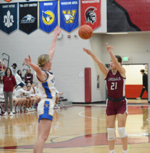 Staff Photo by Jake Olson: Fairmont's Gavin Kester rifles a shot in the opening moments of Tuesday night's contest against Redwood Valley at Martin County Arena.