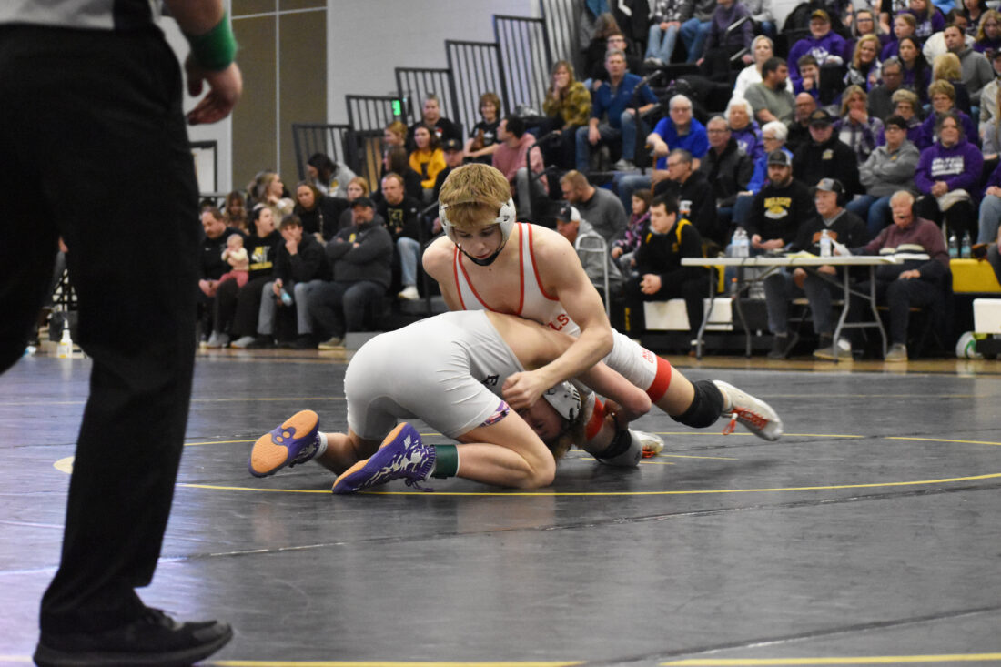 Photo by Ari Selvey: Martin County's Pierce Rohman grapples with New Ulm Area's Kane Johnson in the Section 3AA Individual Wrestling Tournament Championship at 133 Saturday at Hutchinson High School.
