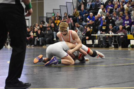 Pierce Rohman (133 lbs) earned two more tech fall wins in the semifinal and championship rounds, beating New Ulm’s Kane Johnson to earn the top podium finish. Torrey Paplow (152 lbs) was the other Red Bull to earn first place after muscling past Braxton Kiecker from New Ulm in a 103 decision victory. Aaron Becker (215 lbs) and DJ Miller (285 lbs) both had to bounce back from championship round losses to earn their tickets to state. After dropping to Michael Markgraf from Hutchinson, Becker rebounded with a fall victory past New Ulm’s Dirk Haynes. Miller defeated New-London Spicer’s Garret Leenstra in the second-place bout after falling to Mason Adams from Lake Crystal Wellcome Memorial.