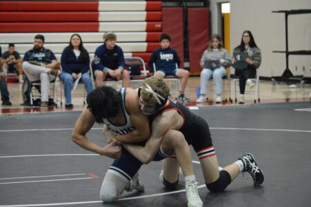 File Photo by Jake Olson: Martin County Red Bull wrestler Pierce Rohman grapples with St. Peter's Manuel Gomez during a home triangular on Thursday, Feb. 8, at the Fairmont High School gymnasium.