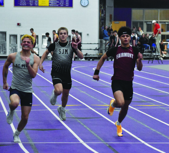 For the girls, Nathaliah Johnson tied for second in the 60 (8.4) and took second in the 200 (29.3), while Madi Thompson won the 400 (1:05.0), with Amiya Dunn taking third (1:08.7). Adylen Laven placed third in the 60-meter hurdles (10.8), while Addison Folkerts took third in the shot put (30-6). Ellie Perkins placed first in pole vault (10-0), and Harlee Fastnacht (30-10) and Emersen Jackson (30-0) took second and third, respectively, in triple jump. The Fairmont 4×200 relay team of Johnson, Addison Toothaker, Emelia Klanderud and Mollie Leiding took first (1:55.0).